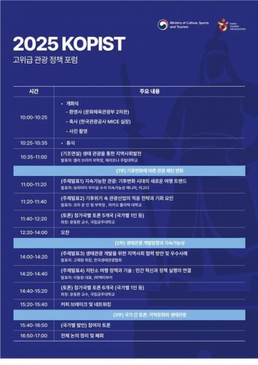 문화체육관광부는 한국관광공사(관광공사)와 함께 16일 전라남도 여수에서 '2025 한국 관광개발 협력사업(코피스트·KOPIST) 고위급 관광정책 포럼'을 개최한다고 밝혔다.