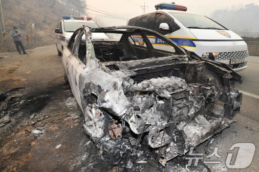 경북 영덕군 매정리 마을로 들어가는 도로에 불에 탄 승용차. 2025.3.26/뉴스1 ⓒ News1 최창호 기자 |