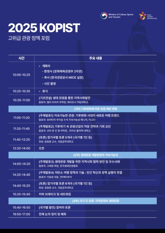 [서울=뉴스핌] 양진영 기자 = 문화체육관광부는 한국관광공사와 함께 16일, 여수에서 '2025 코피스트(KOPIST) 고위급 관광정책 포럼'을 개최한다.