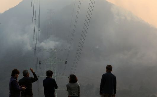 지난 3월 발생한 경남 산청 산불 당시 주민들이 산불 연기가 치솟아오르는 모습을 지켜보고 있다. /뉴스1 |