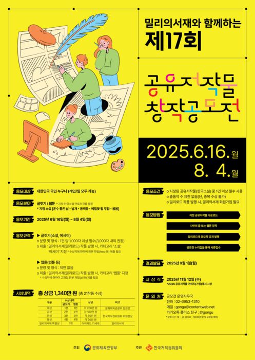 문화체육관광부·한국저작권위원회는 도서 플랫폼 KT 밀리의서재와 함께 '제17회 공유저작물 창작공모전'을 8월 4일까지 개최한다고 16일 밝혔다.