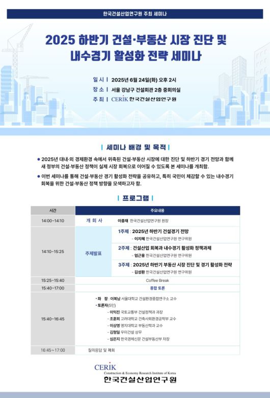 2025 하반기 건설부동산 시장 진단 및 내수경기 활성화 전략 세미나 포스터. [자료=한국건설산업연구원] |