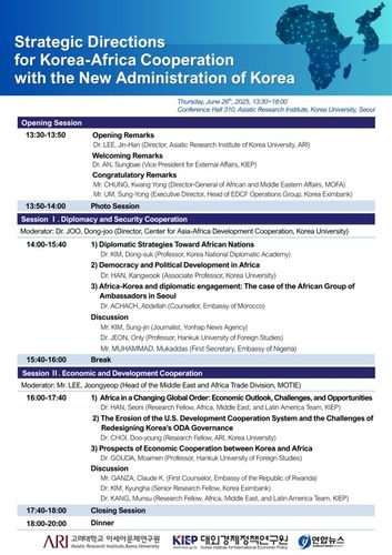 ▲ 고려대 아세아문제연구원(원장 이진한)은 대외경제정책연구원(원장 이시욱)과 오는 26일 서울 성북구 고려대 서울캠퍼스 아세아문제연구원 회의실에서 '새정부의 한국과 아프리카 협력 전략 모색'을 주제로 국제세미나를 개최한다고 16일 밝혔다. 이진한 원장의 개회사와 안성배 대외경제정책연구원 대외협력부원장의 환영사에 이어 정광용 외교부 아프리카중동국장과 엄성용 한국수출입은행 부행장이 축사한다. 이후 '한-아프리카 외교 및 안보 협력'과 '한-아프리카 경제 및 개발 협력'을 소주제로 각 토론 세션이 이어진다. 행사는 국가기간뉴스통신사 연합뉴스가 후원한다. (서울=연합뉴스)