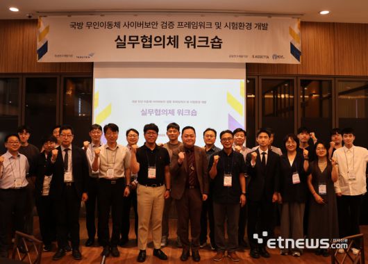 지난 12일 서울 LW컨벤션에서 열린 '국방 무인이동체 사이버보안 검증 프레임워크 및 시험환경 개발 실무협의체 워크숍'에서 관계자들이 기념촬영했다. |