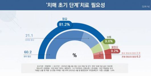 또 응답자의 78.3%는 중증 치매로 인한 국민 고통과 돌봄 비용 감소 목표에 공감하며 '새 정부가 경도인지장애 등 초기 단계의 진단 검사, 신약 치료 지원을 중심으로 보다 선제적인 치매관리 정책을 추진해야 한다'고 답했다.