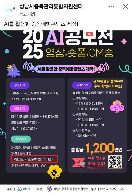 앞서 성남시는 오는 16일부터 8월 16일까지 AI를 활용한 중독예방콘텐츠를 제작하는 '2025 AI 공모전' 진행을 알린 바 있다. 성남시 시민과 직장인 등을 대상으로 생성형AI를 활용해 4대 중독을 예방하는 내용의 영상이나 숏폼 등을 제작하는 공모전이다.