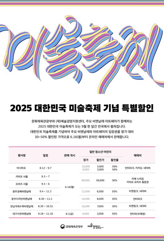 16일 문화체육관광부와 예술경영지원센터는 오는 16일부터 온라인 예매처에서 ‘2025 대한민국 미술축제 기념 입장권 특별할인’을 시작한다고 밝혔다. 이번 특별할인은 미술축제에 대한 국민의 관심을 높이고, 사전에 참여를 독려하기 위해 마련됐다. 세계 미술인들의 이목이 집중되는 국제 아트페어 ‘키아프·프리즈 서울’과 국내 최대규모의 청년 아트페어 ‘아시아프’는 물론 청주공예비엔날레, 광주디자인비엔날레, 전남국제수묵비엔날레, 대구사진비엔날레도 함께 할 예정이다.