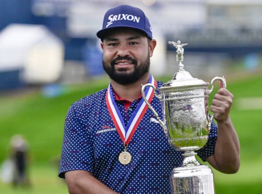 J.J. 스펀이 15일(현지시간) PGA 투어 US오픈에서 우승한 뒤 트로피와 기념촬영을 하고 있다. /UPI 연합뉴스 |