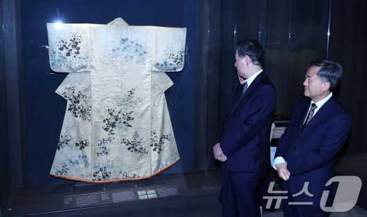 (서울=뉴스1) 박지혜 기자 = 김재홍 국립중앙박물관장(오른쪽)과 후지와라 마코토 도쿄국립박물관장이 16일 서울 용산구 국립중앙박물관 상설전시관에서 열린 한일 국교 정상화 60주년 기념 특별전 '일본미술, 네 가지 시선' 언론공개회에서 가을풀무니 고소데를 살펴보고 있다. '가을풀무늬 고소데(소맷부리가 짧은 기모노)'는 일본 장식 화풍의 대가로 알려진 에도 시대의 화가 오가타 고린이 직접 가을풀무늬를 그려 넣은 옷으로, 도쿄국립박물관의 대표 전시품이다. 2025.6.16/뉴스1