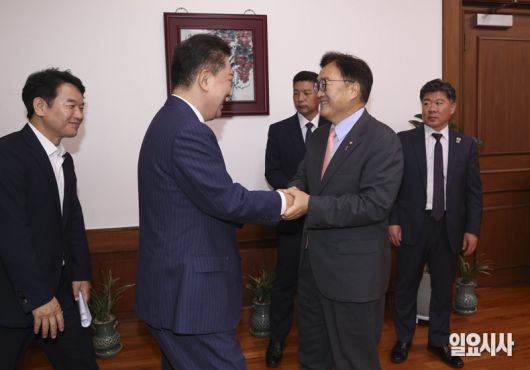 더불어민주당 김병기 당대표 직무대행 겸 원내대표가 16일 오전 서울 여의도 국회 의장실을 예방해 우원식 국회의장과 악수를 하고 있다.