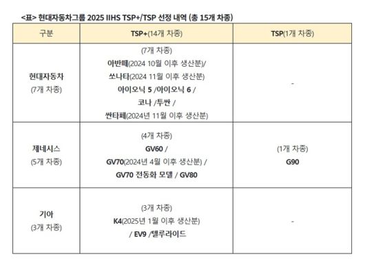 이에 따라 올해 현대차그룹에서 TSP 이상 등급을 받은 차종은 현대차 7개, 제네시스 5개, 기아 3개 등 총 15개로, 글로벌 자동차그룹 기준 1위에 올랐다. 2위는 마쓰다(8개), 3위는 혼다(7개)였다.