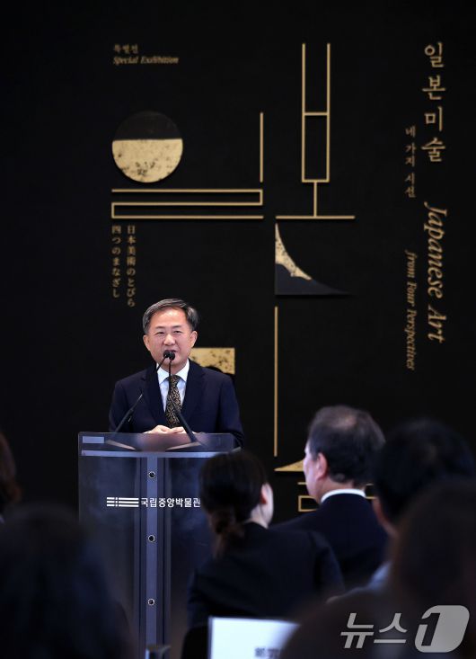 (서울=뉴스1) 박지혜 기자 = 김재홍 국립중앙박물관장이 16일 서울 용산구 국립중앙박물관 상설전시관에서 열린 한일 국교 정상화 60주년 기념 특별전 '일본미술, 네 가지 시선' 언론공개회에서 인사말을 하고 있다. 국립중앙박물관과 일본 도쿄국립박물관이 공동으로 개최하는 이번 전시는 두 기관의 소장품 62건을 중심으로 일본미술의 외적 아름다움과 내면의 정서를 감상할 수 있도록 구성했으며, 오는 17일부터 8월 10일까지 개최된다. 2025.6.16/뉴스1