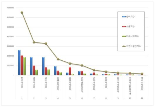 3위, 금호타이어 브랜드는 참여지수 1,867,627 소통지수 820,077 커뮤니티지수 602,244가 되면서 브랜드평판지수 3,289,949로 분석됐다. 지난 5월 브랜드평판지수 4,468,597과 비교해보면 26.38% 하락했다.