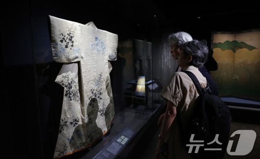 (서울=뉴스1) 박지혜 기자 = 16일 서울 용산구 국립중앙박물관 상설전시관에서 열린 한일 국교 정상화 60주년 기념 특별전 '일본미술, 네 가지 시선' 언론공개회에서 참석자들이 가을풀무니 고소데를 살펴보고 있다. '가을풀무늬 고소데(소맷부리가 짧은 기모노)'는 일본 장식 화풍의 대가로 알려진 에도 시대의 화가 오가타 고린이 직접 가을풀무늬를 그려 넣은 옷으로, 도쿄국립박물관의 대표 전시품이다. 2025.6.16/뉴스1