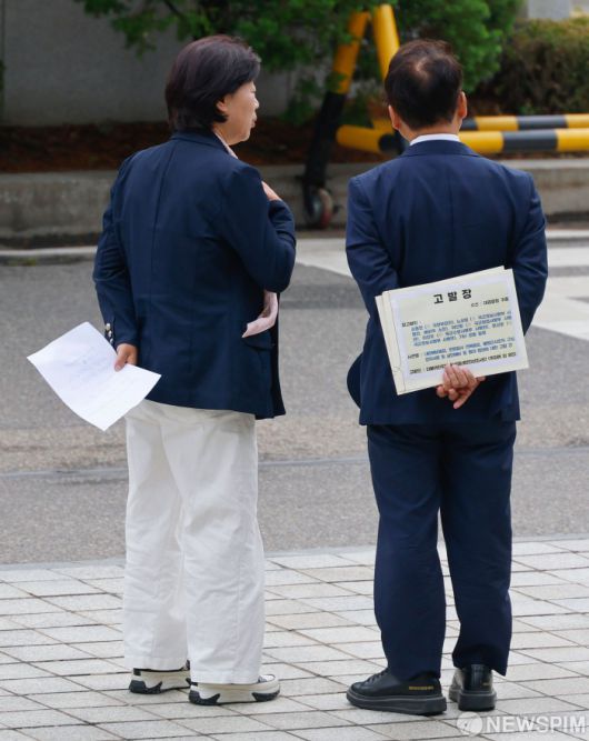 [서울=뉴스핌] 류기찬 인턴기자 = 박선원 의원(오른쪽)과 서영교 의원이 16일 오전 서울 서초구 대검찰청 민원실에 김용현 전 국방부 장관 등에 대한 고발장 접수를 하기에 앞서 추미애 단장을 기다리고 있다. 2025.06.16 ryuchan0925@newspim.com