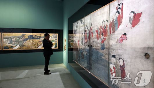 (서울=뉴스1) 박지혜 기자 = 16일 서울 용산구 국립중앙박물관 상설전시관에서 열린 한일 국교 정상화 60주년 기념 특별전 '일본미술, 네 가지 시선' 언론공개회에서 참석자가 전시를 둘러보고 있다. 국립중앙박물관과 일본 도쿄국립박물관이 공동으로 개최하는 이번 전시는 두 기관의 소장품 62건을 중심으로 일본미술의 외적 아름다움과 내면의 정서를 감상할 수 있도록 구성했으며, 오는 17일부터 8월 10일까지 개최된다. 2025.6.16/뉴스1