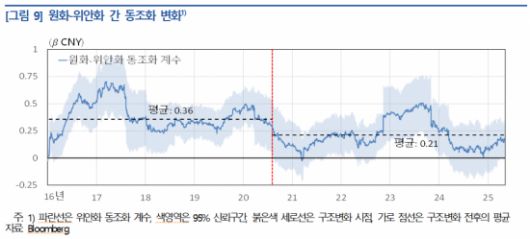 원화와 위안화는 높은 상관관계를 가지며 동조화를 지속해 왔으나 시기에 따라 그 정도는 달라졌다. 특히 2018년 4월에서 2019년 9월 트럼프 1기 미·중 무역 갈등기, 2022년 2월~2023년 4월 미국 연방준비제도(Fed)의 금리 인상기, 2024년 10월 이후 트럼프 2기 대통령선거 당선 전후 시기에 상관 계수가 높았다. 최 차장은 "높은 동조화의 배경에는 미국 달러화의 공통 영향, 양국 경제의 높은 연계성, 근접한 경제 권역의 통화가 한묶음으로 거래되는 외환시장 거래 관행 등의 구조적 요인이 작용하고 있다"고 설명했다.