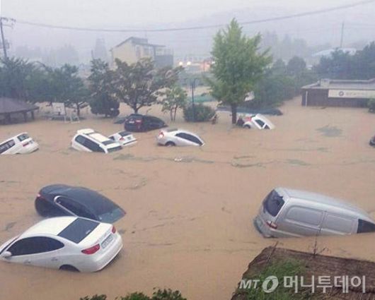 2014년 부산에 내린 폭우로 부산 기장군 장안읍 일대가 침수돼 자동차들이 흙탕물에 완전히 잠겨 있다. /사진=뉴스1 |