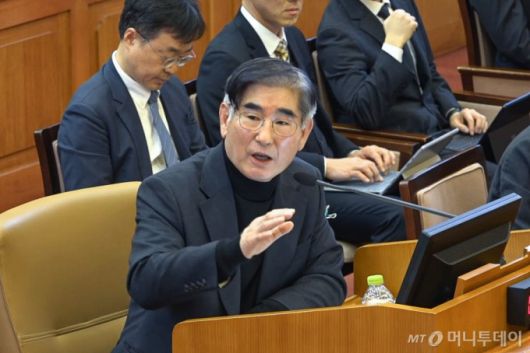 김용현 전 국방부 장관이 23일 오후 서울 종로구 헌법재판소에서 열린 윤석열 대통령 탄핵심판 4차변론에 증인으로 출석해 발언하고 있다. 2025.1.23/사진=헌법재판소 제공 |