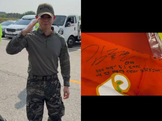 공개된 영상에는 그리가 군복을 입고 거수 경례를 하는 모습이 담겼다. ‘벌크업’으로 늠름해진 자태가 눈길을 끈다.