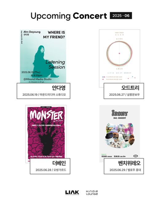 한국음악레이블산업협회(이하, 음레협)가 운영하는 킨디라운지가 다양한 장르와 형식으로 구성된 6월의 대중음악 공연을 소개한다. 이번에는 리스닝 세션, 단독 공연, 클럽 투어 등 관객과의 거리를 좁히는 기획이 다수 포함되어 있어 주목된다.