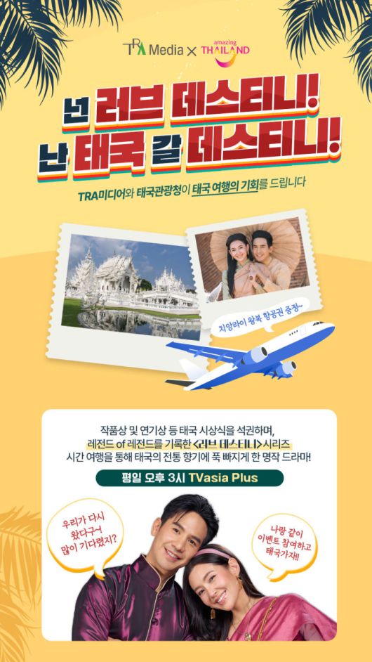 [서울=뉴스핌] 조한웅 기자 = TRA미디어가 태국관광청과 함께 태국 드라마 <러브 데스티니> 시청자 대상 이벤트 '넌 러브 데스티니! 난 태국 갈 데스티니!'를 진행한다.