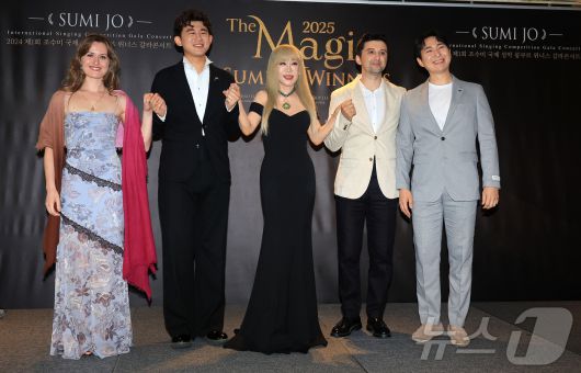 (서울=뉴스1) 김진환 기자 = 프랑스 문화예술공로훈장 최고 등급 '코망되르'를 수훈한 세계적인 소프라노 조수미가 16일 오후 서울 중구 더플라자호텔 메이플홀에서 열린 '더 매직, 2025 조수미와 위너들'(The Magic, 2025 Sumi Jo and Winners) 개최 기념 기자간담회에서 제1회 조수미 국제 성악 콩쿠르 수상자들과 포즈를 취하고 있다. 사진 왼쪽부터 줄리엣 타키노, 리지하오, 조수미, 조르주 비르반, 이기업. 조수미는 오는 22일 롯데콘서트홀에서 콩쿠르 입상자들과 함께 무대에 오를 예정이다. 2025.6.16/뉴스1
