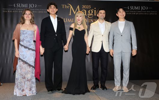 (서울=뉴스1) 김진환 기자 = 프랑스 문화예술공로훈장 최고 등급 '코망되르'를 수훈한 세계적인 소프라노 조수미가 16일 오후 서울 중구 더플라자호텔 메이플홀에서 열린 '더 매직, 2025 조수미와 위너들'(The Magic, 2025 Sumi Jo and Winners) 개최 기념 기자간담회에서 제1회 조수미 국제 성악 콩쿠르 수상자들과 포즈를 취하고 있다. 사진 왼쪽부터 줄리엣 타키노, 리지하오, 조수미, 조르주 비르반, 이기업. 조수미는 오는 22일 롯데콘서트홀에서 콩쿠르 입상자들과 함께 무대에 오를 예정이다. 2025.6.16/뉴스1