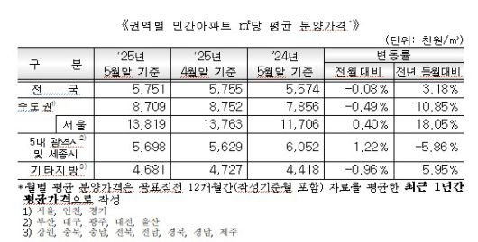 전국 평균 분양가는 전월(1902만5000원)보다 0.08% 내린 1901만2000원으로 집계됐다.