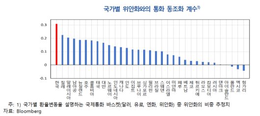 국가별로 보면 원화는 기축통화 보유국을 제외한 33개국 통화 중 위안화와의 동조화 계수(0.31)가 가장 높게 나타났다. 동조화 계수가 0.31이라는 것은 주요 국제통화 중 위안화가 원화 환율변동에 미치는 영향이 31%라는 의미다.