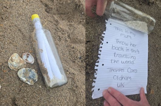 멜리아는 동봉한 쪽지에는 “이분은 우리 엄마예요. 다시 바다에 넣어주세요. 엄마는 세상을 여행하고 있습니다. 고맙습니다. 영국 올덤에서 카라”라고 적었다.