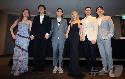 (서울=뉴스1) 김진환 기자 = 프랑스 문화예술공로훈장 최고 등급 '코망되르'를 수훈한 세계적인 소프라노 조수미가 16일 오후 서울 중구 더플라자호텔 메이플홀에서 열린 '더 매직, 2025 조수미와 위너들'(The Magic, 2025 Sumi Jo and Winners) 개최 기념 기자간담회에서 제1회 조수미 국제 성악 콩쿠르 수상자들과 포즈를 취하고 있다. 사진 왼쪽부터 줄리엣 타키노, 리지하오, 지휘자 최영선, 조수미, 조르주 비르반, 이기업. 조수미는 오는 22일 롯데콘서트홀에서 콩쿠르 입상자들과 함께 무대에 오를 예정이다. 2025.6.16/뉴스1