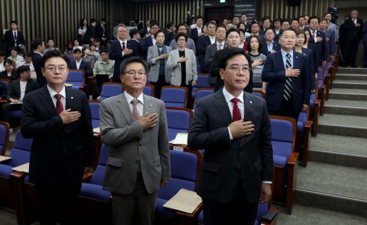 16일 서울 여의도 국회에서 열린 ‘2025 국민의힘 원내대표 선출 선거 의원총회’에서 송언석(오른쪽부터), 이헌승, 김성원 원내대표 후보가 국민의례를 하고 있다. 신태현 기자 holjjak@ |