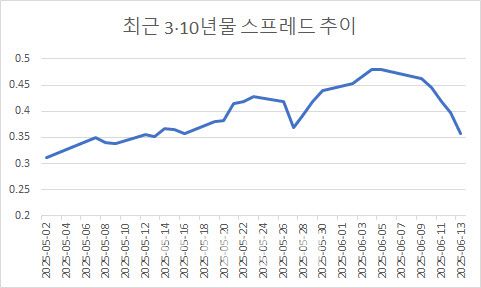 채권 가격과 금리가 반대로 움직이는 만큼 10년물 금리는 하락, 3년물 금리는 상승한 셈이다. 이에 3년물과 10년물의 금리차는 같은 기간 46.7bp(1bp=0.01%포인트)에서 35.7bp로 급격히 좁혀졌다.