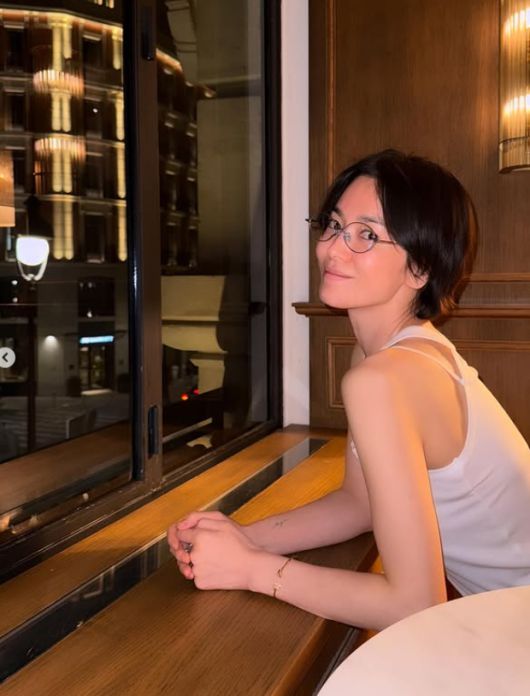 공개된 사진 속 송혜교는 화장기 없는 수수한 모습에도 불구하고 독보적인 아우라를 뽐냈다. 흰색 민소매 티셔츠에 안경을 쓴 자연스러운 차림은 마치 화보의 한 장면을 연상시키며, 43세라는 나이가 믿기지 않는 비주얼을 자랑했다.