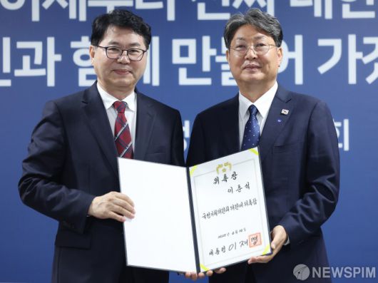 [서울=뉴스핌] 김학선 기자 = 이한주 국정기획위원회 위원장(왼쪽)이 16일 서울 종로구 정부서울청사 창성동 별관에서 열린 출범식에서 경제2분과장을 맡은 이춘석 더불어민주당 의원에게 위촉장을 수여한 뒤 기념촬영을 하고 있다. 이재명 정부의 대통령직인수위원회 역할을 하는 국정기획위에서는 100대 국정과제를 정리하고 과제별로 추진 시점과 목표 등을 정해 '국정운영 5개년 계획'을 마련할 방침이다. 2025.06.16 yooksa@newspim.com |