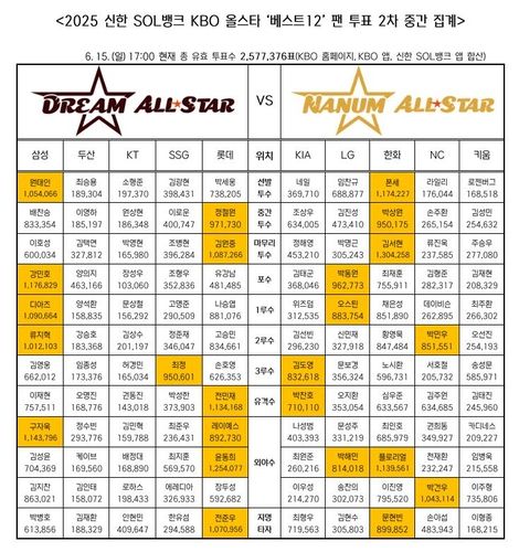 2025 KBO 올스타 베스트12 팬 투표는 오는 22일 오후 2시까지 진행된다. 팬 투표(70%)와 선수단 투표(30%)를 합산해 최종 선정된 베스트12는 6월 23일 발표될 예정이다.