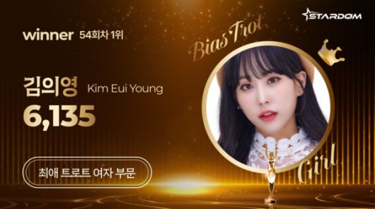 김의영은 6월 둘째주(집계기간 6월 9일~6월 15일) '최애 트롯스타' 여자 부문 주간랭킹에서 정상을 차지했다. 3월 둘째주 1위에 오른 후 14주 연속 정상 등극이다.