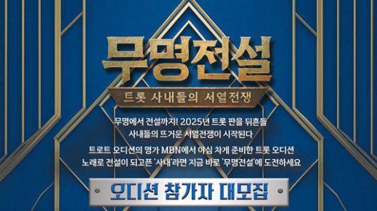 한편 '무명전설'은 오직 트로트를 사랑하는 남성이라면 누구나 지원 가능하다.