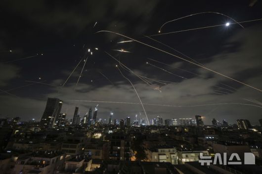 [텔아비브=AP/뉴시스] 15일(현지 시간) 이스라엘 텔아비브 상공에서 이스라엘 방공 시스템 아이언 돔이 이란의 미사일을 요격하고 있다. 2025.06.16. |