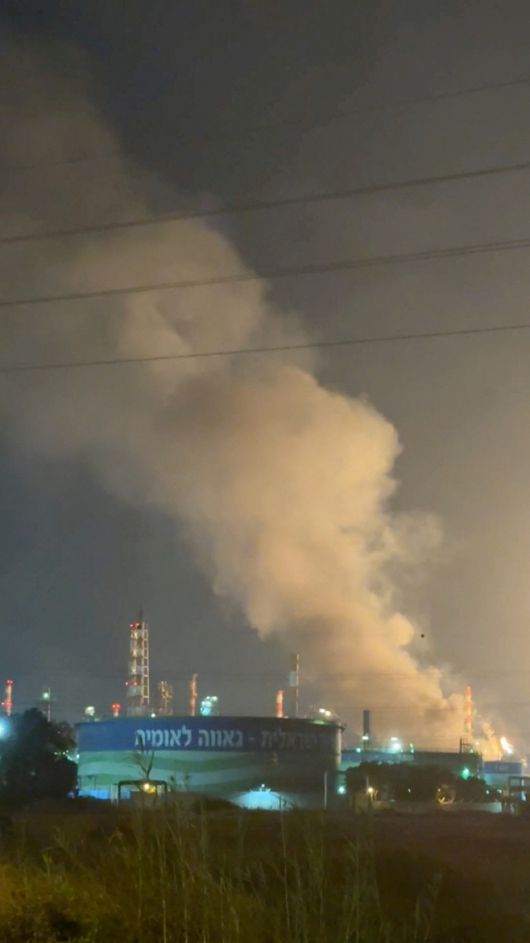 16일(현지시간) 이란의 미사일 공격을 받은 이스라엘 하이파의 정유 시설 단지에서 연기가 피어오르고 있다./로이터 연합뉴스 |