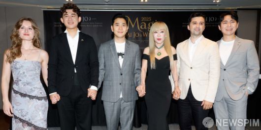 [서울=뉴스핌] 류기찬 인턴기자 = 세계적인 소프라노 조수미(왼쪽에서 네번째)가 16일 오후 서울 중구 더플라자호텔에서 열린 2025 조수미 콘서트 '더 매직, 2025 조수미와 위너들' 기자간담회를 마친 뒤 기념 사진을 촬영하고 있다. 왼쪽부터 줄리엣 타키노, 지하오 리, 최영선, 조수미, 조르주 비르반, 이기업. 2025.06.16 ryuchan0925@newspim.com