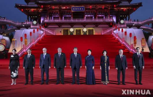 [시안=신화/뉴시스] 시진핑 중국 국가주석이 16일부터 18일까지 카자흐스탄을 국빈 방문하고, 아스타나에서 열리는 제2차 중국-중앙아시아 정상회의에 참석한다. 사진은 2023년 5월19일 중국 시안에서 시주석 부부가 중앙아시아 정상들이 환영만찬을 시작하기 전 기념촬영을 하는 모습. 2025.06.16 |