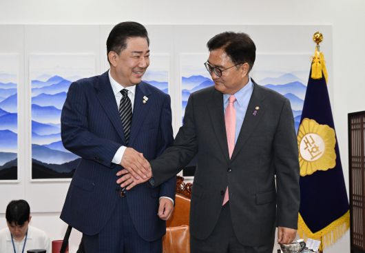 김병기 더불어민주당 대표 직무대행 겸 원내대표가 16일 서울 여의도 국회에서 우원식 국회의장을 예방하고 있다. 뉴시스 |