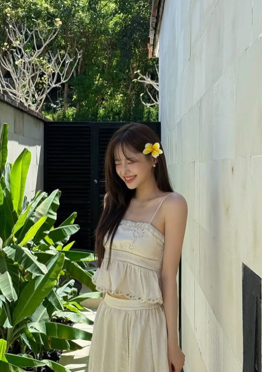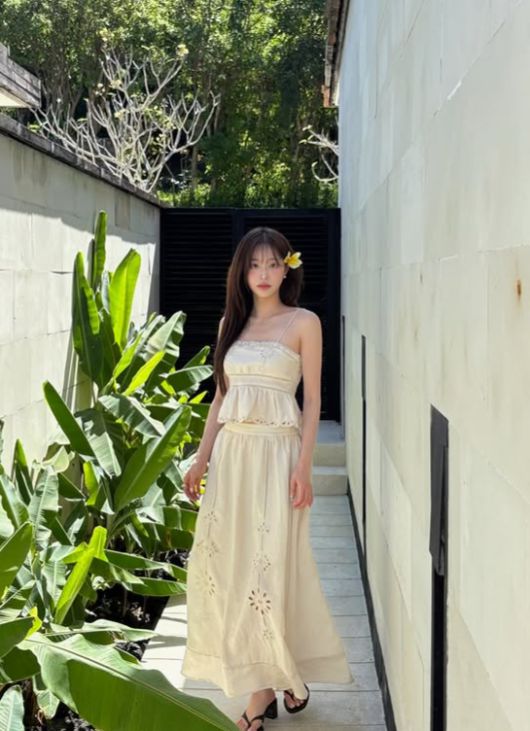 공개된 사진 속 츄는 베이지 톤의 린넨 투피스 원피스에 블랙 스트랩 샌들을 매치해 단정하면서 청초한 휴양지 스타일을 완성했다.