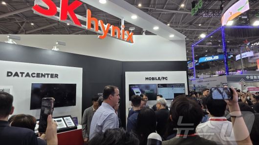 대만 타이베이 난강 전시관에서 20일 열린 '컴퓨텍스 2025'에서 젠슨 황 엔비디아 CEO의 SK하이닉스 전시관 방문에 많은 관람객들이 몰렸다. 2025.5.20/뉴스1 ⓒ News1 김민석 기자 ⓒ News1 김민석 기자 |