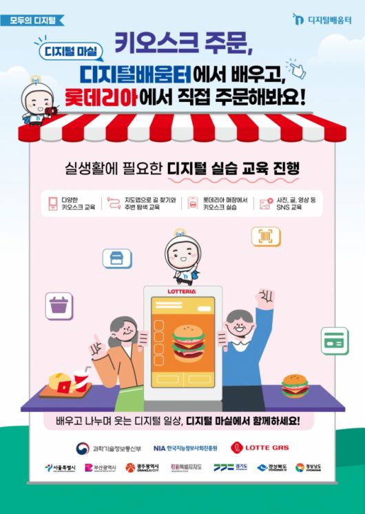 디지털 배움터는 과학기술정보통신부, NIA한국지능정보사회진흥원이 주관하는 사업이다. 고령층은 디지털 배움터에서 키오스크 이용 방법을 이론으로 배운다. 이후 디지털 마실을 통해 롯데리아 매장에서 현장 실습을 할 수 있다.