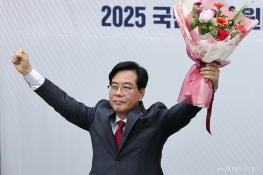 (서울=뉴스1) 안은나 기자 = 국민의힘 신임 원내대표로 선출된 송언석 의원이 16일 오후 서울 여의도 국회에서 열린 의원총회에서 꽃다발을 들어보이고 있다. 2025.6.16/뉴스1 Copyright (C) 뉴스1. All rights reserved. 무단 전재 및 재배포, AI학습 이용 금지. /사진=(서울=뉴스1) 안은나 기자 |