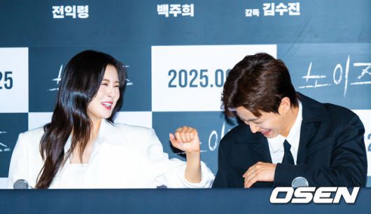[OSEN=박준형 기자] 16일 서울 코엑스 메가박스에서 영화 ‘노이즈’ 언론시사회가 진행됐다. 영화 ‘노이즈’는 층간소음으로 매일 시끄러운 아파트 단지에서 실종된 여동생을 찾아 나선 주영(이선빈 분)이 미스터리한 사건과 맞닥뜨리며 겪는 일을 그린다. 배우 이선빈과 김민석이 미소 짓고 있다 2025.06.16 / soul1014@osen.co.kr