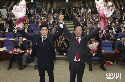 ⓒ일요시사 국민의힘 송언석 신임 원내대표(오른쪽)와 김용태 비상대책위원장이 16일 서울 여의도 국회에서 열린 국민의힘 원내대표 선출 의원총회에서 꽃다발을 들고 기념촬영을 하고 있다. 일요시사=고성준 기자(joonko1@ilyosisa.co.kr) <joonko1@ilyosisa.co.kr> 저작권자 ©일요시사 무단전재 및 재배포 금지
